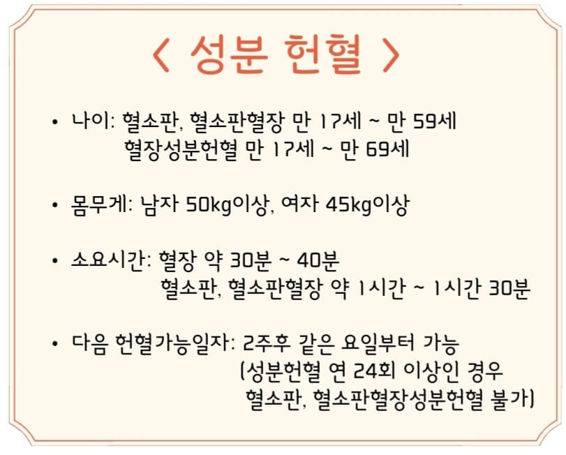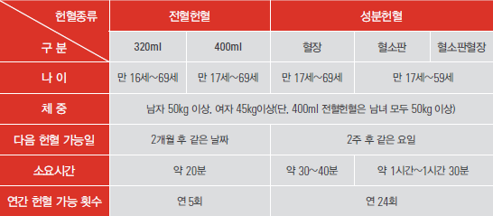 ◆ 전혈 헌혈 : 남성 16~69세 : 2개월에 1회 여성 : 3개월에 1회 ◆ 혈소판 헌혈 : 2주(17~59세) ◆ 혈장 헌혈 : 2주(17~69세) 전혈 헌혈 이 적혈구, 백혈구, 혈소판, 혈장 등 혈액을 전체적으로 채취하는 방법입니다. 남자는 두 달에 한 번, 여자는 두 달에 한 번. 적혈구가 회복되는 데 시간이 걸리기 때문에 3개월에 한 번씩 가능하다.
